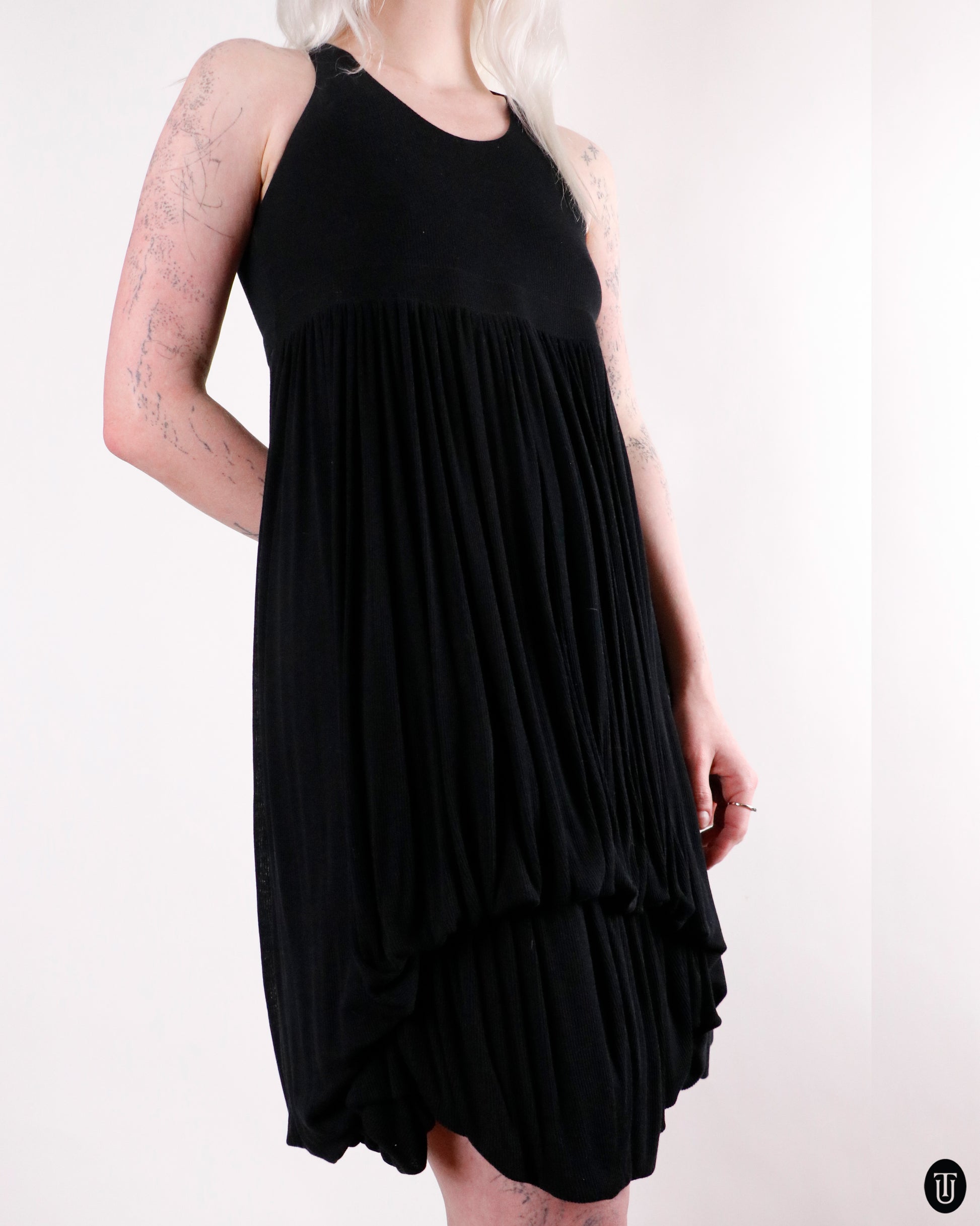 This Givenchy dress from 2009 is designed by Ricardo Tisci and cut in a fluid, softly voluminous silhouette, defined by its gathered balloon hem and sculptural drape. Crafted in Tencel, the fabric has a smooth, breathable quality with a subtle weight that allows the shape to fall naturally while retaining structure. Rendered in deep black, the piece carries a quiet versatility, equally suited for everyday wear or styled more directionally.