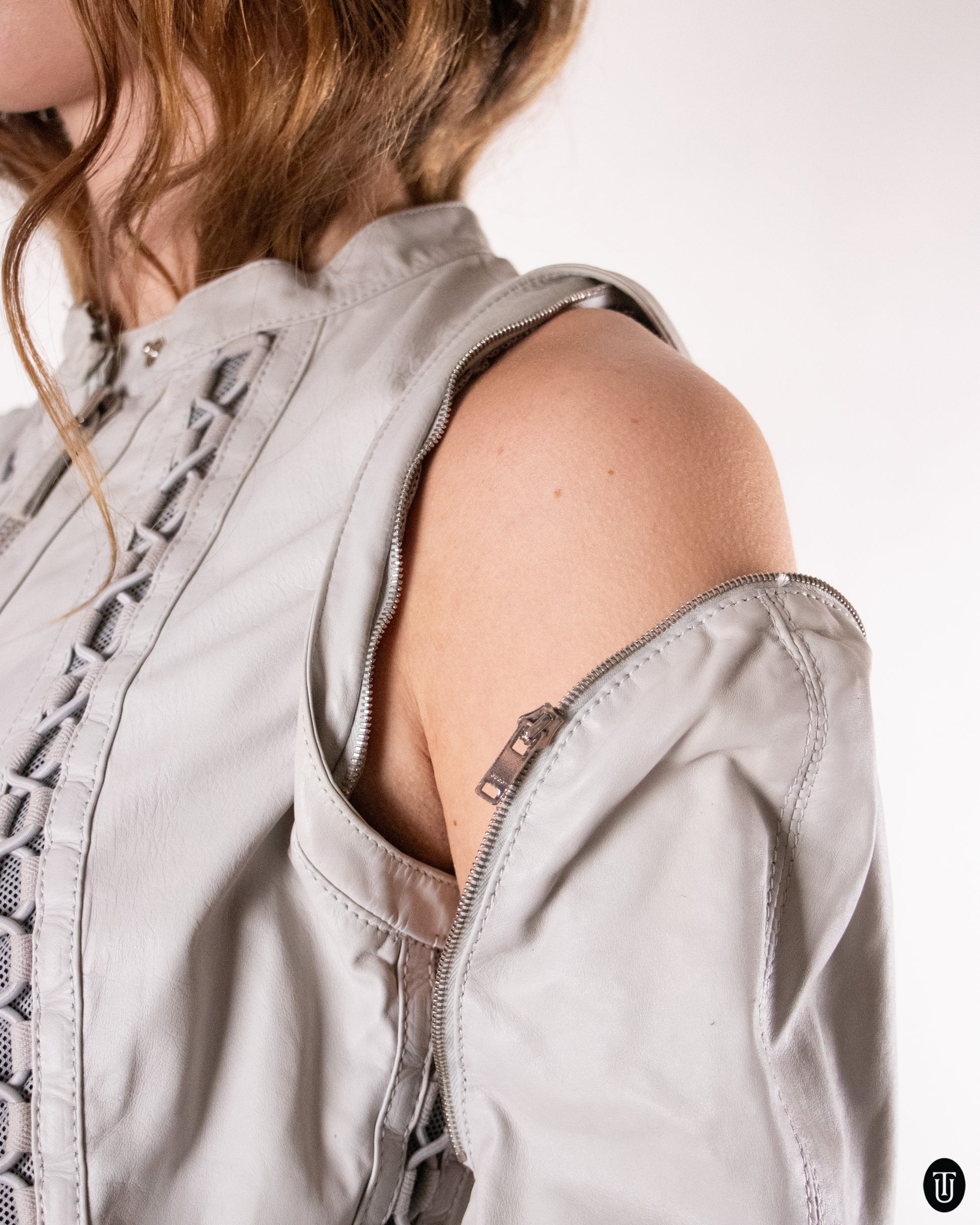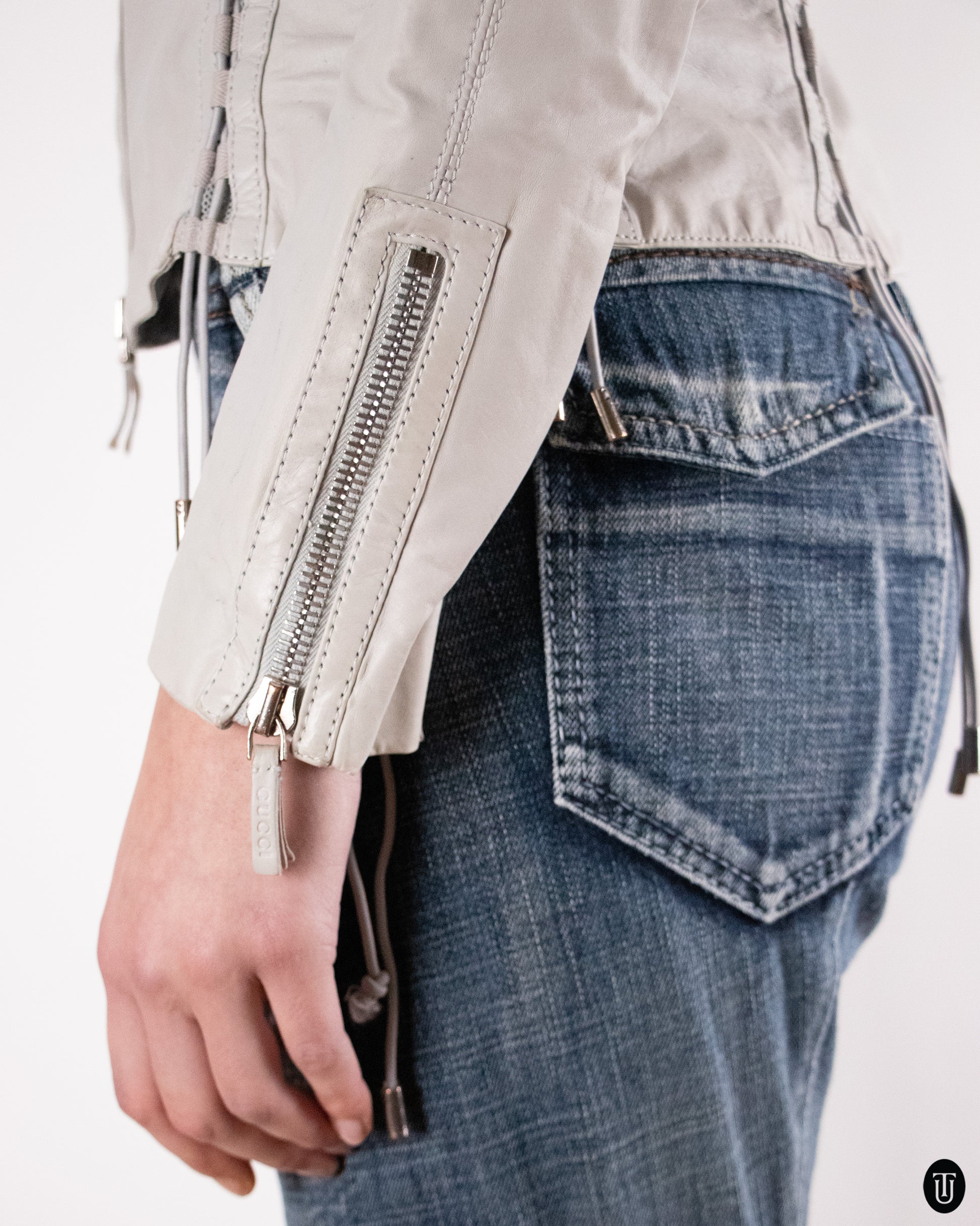 This S/S 2010 Gucci leather jacket is pure elegance and is crafted from supple, high-quality leather in a soft gray tone. The collection was designed under the keen eye of Frida Giannini. Distinctive corset-inspired detailing runs along the front panels, adding texture and structure. A rare Tom Ford collectible that captures the confident, high-gloss minimalism of Gucci’s most influential years.