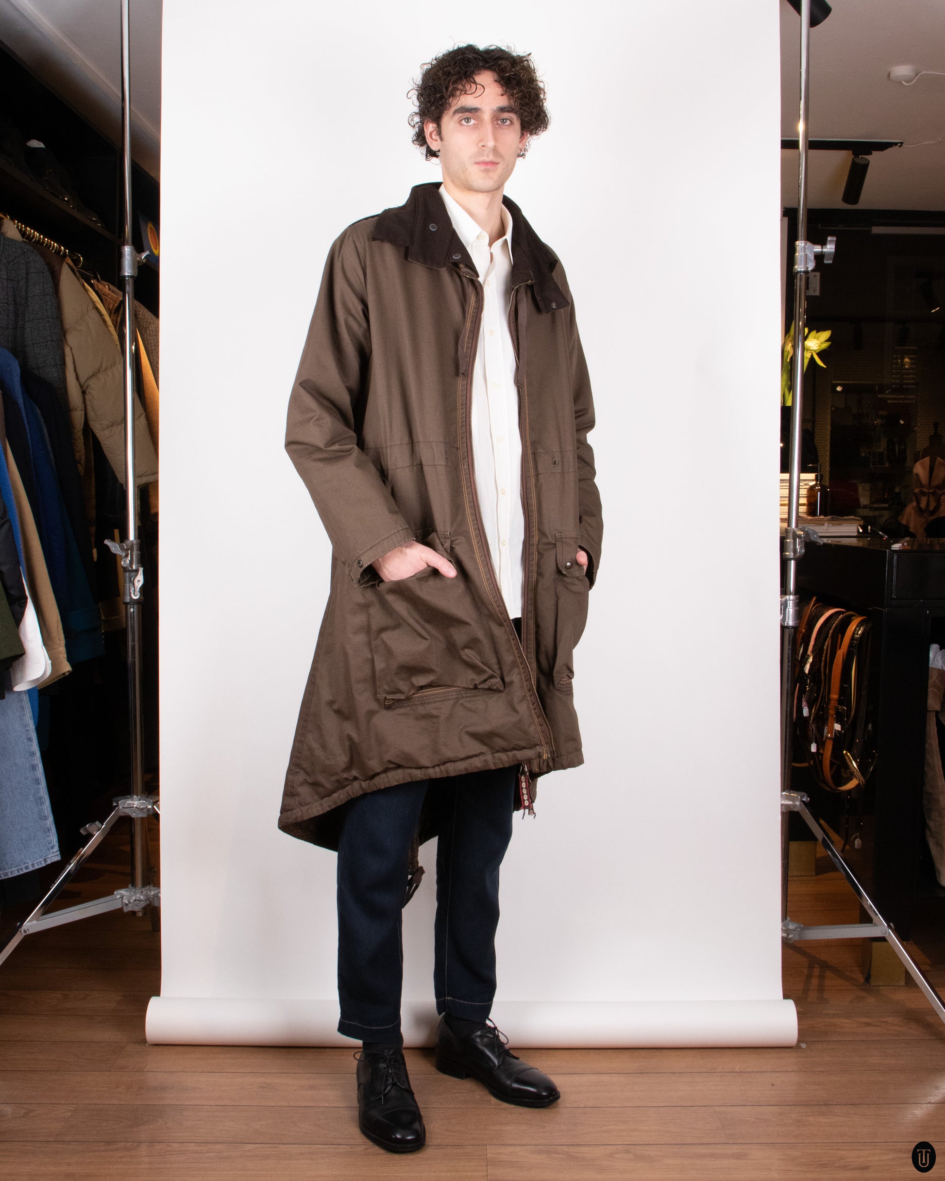 This 2000s Marithé + François Girbaud coat is a utilitarian stand out piece, crafted in a structured olive-brown cotton with a distinctive high funnel neck and zip detail. Designed with functional elements like adjustable drawstrings and multiple flap pockets, it balances technical precision with effortless streetwear cool. The elongated silhouette and innovative construction capture the brand’s signature blend of form, function, and forward-thinking design.