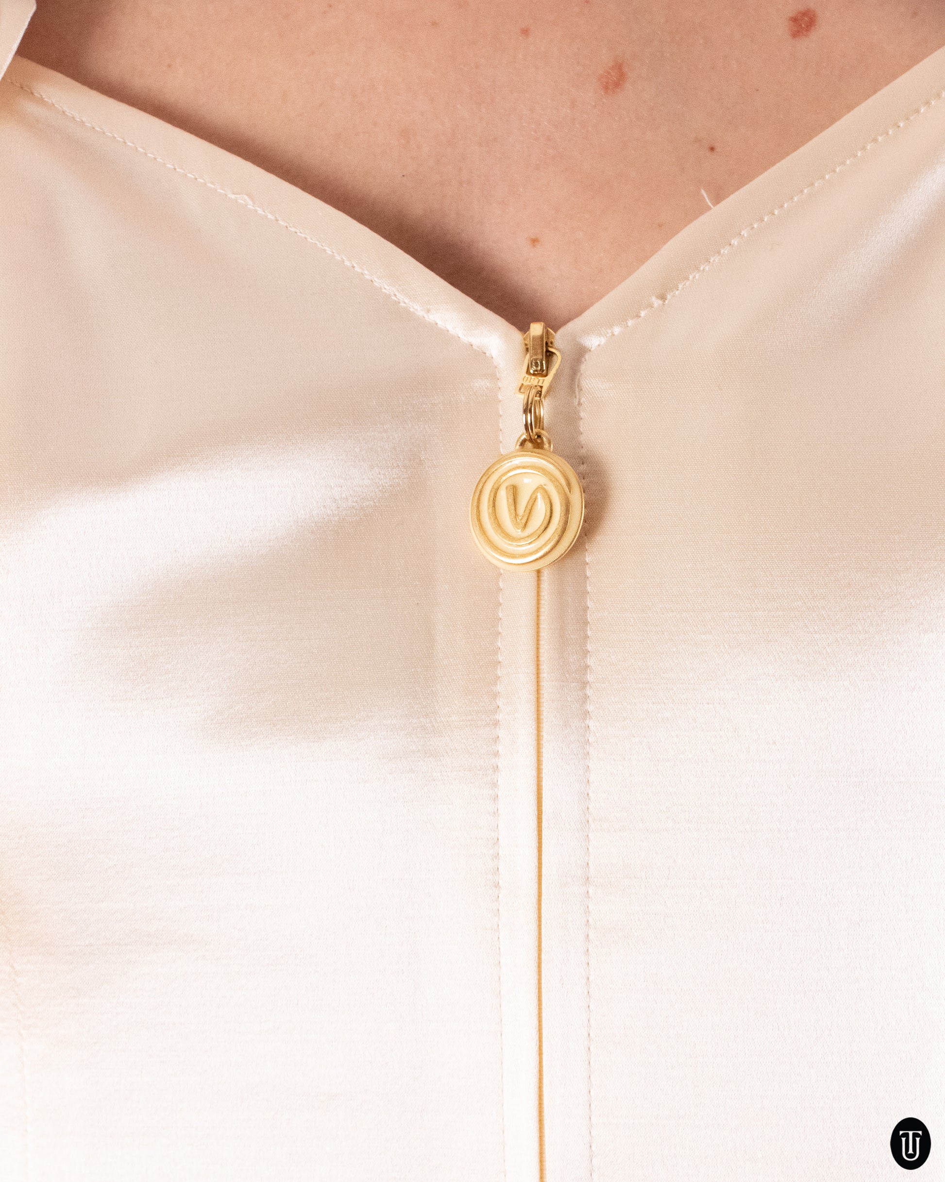 A refined 2000s Valentino top that balances delicate femininity with precise couture-level construction. Crafted in a luxurious wool–silk blend, the fabric has a smooth, softly lustrous surface. The cut is clean and sculptural, designed to sit close to the body without feeling restrictive. Refined hardware details add a quiet sense of luxury and act as focal points against the creamy tone of the fabric. An elegant example of Valentino’s mastery of material and proportion.
