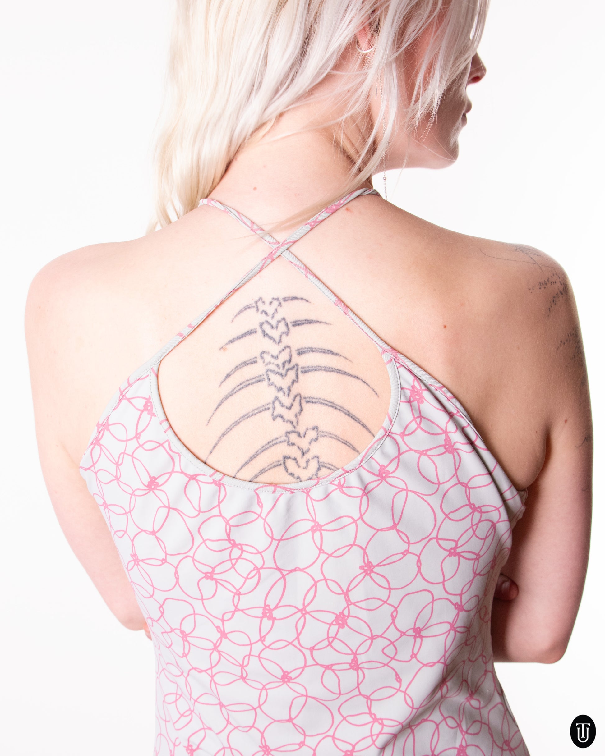 This 2000's Versus by Versace dress is the epitome of Y2K heritage, from the faux halter neck line, the criss-cross back straps to the resin button that gathers the dress at the front. The slightly fitted, slightly a-line dress casually drapes over the body and falls just below the knee line. The light-weight soft gray fabric has hand drawn floral motifs in pink to make it pop.