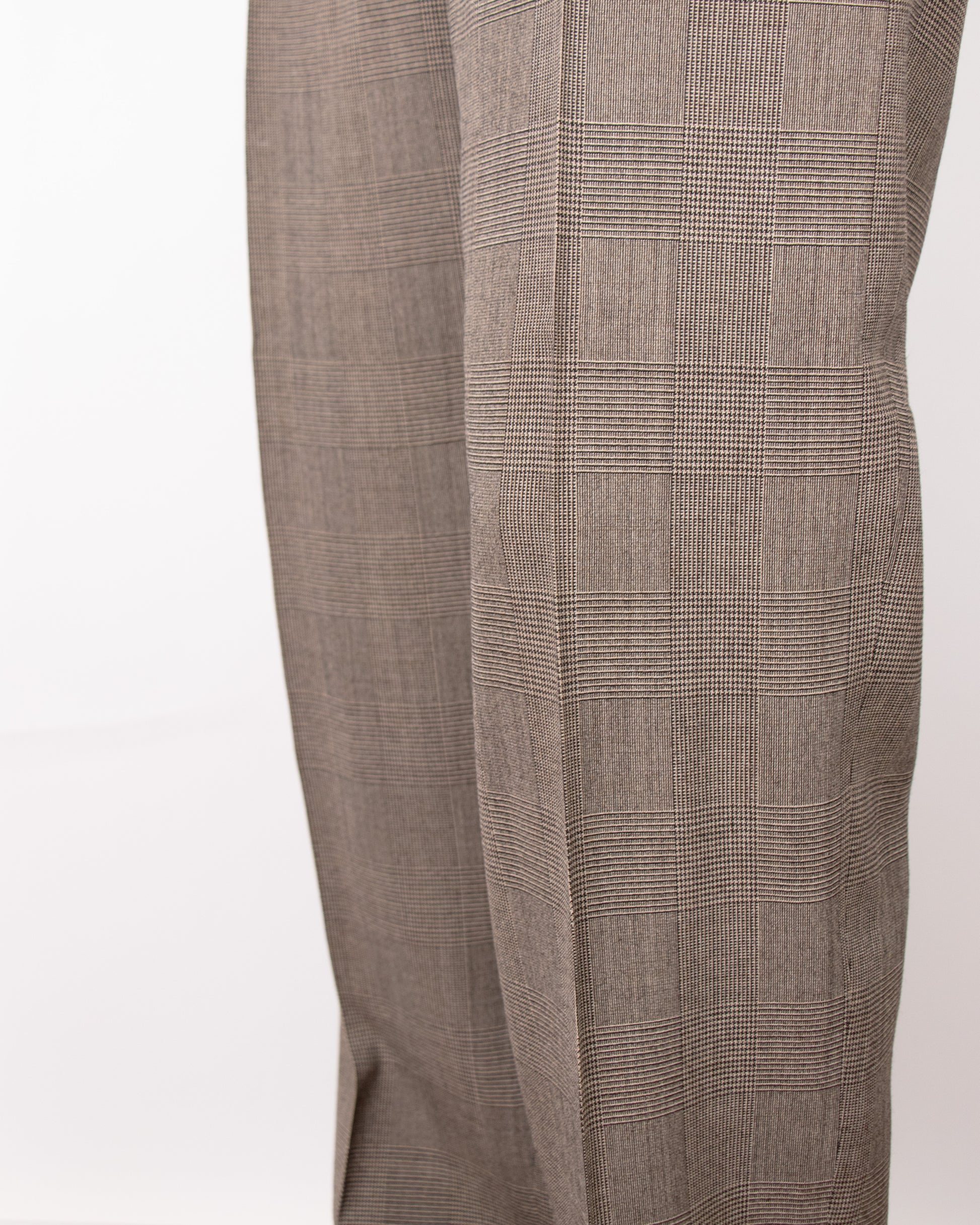 A pair of 1990s Giorgio Armani men’s dress pants in fine wool feature a refined brown checkered woven pattern. With their tailored fit and classic design, they embody the timeless sophistication of Armani's craftsmanship.