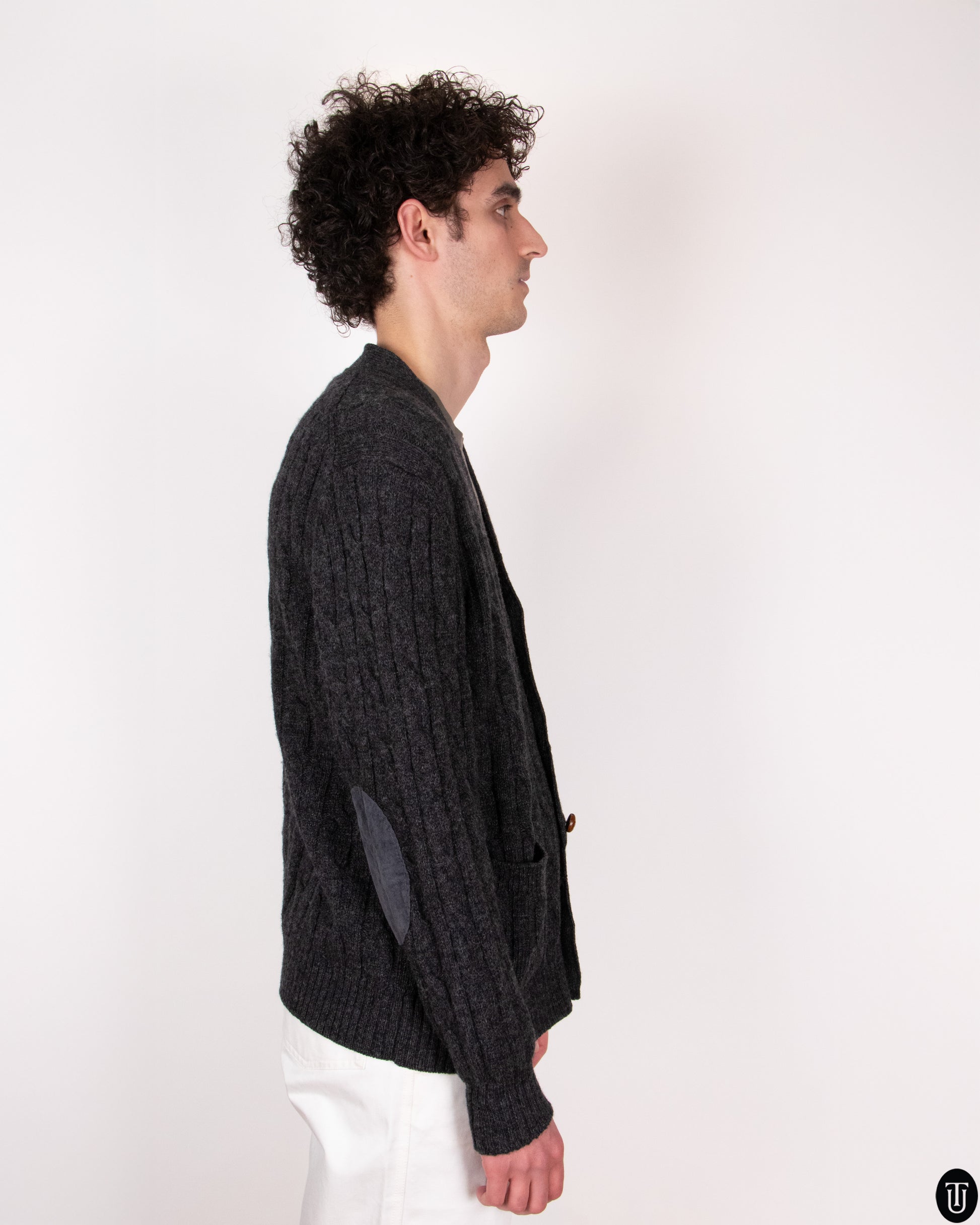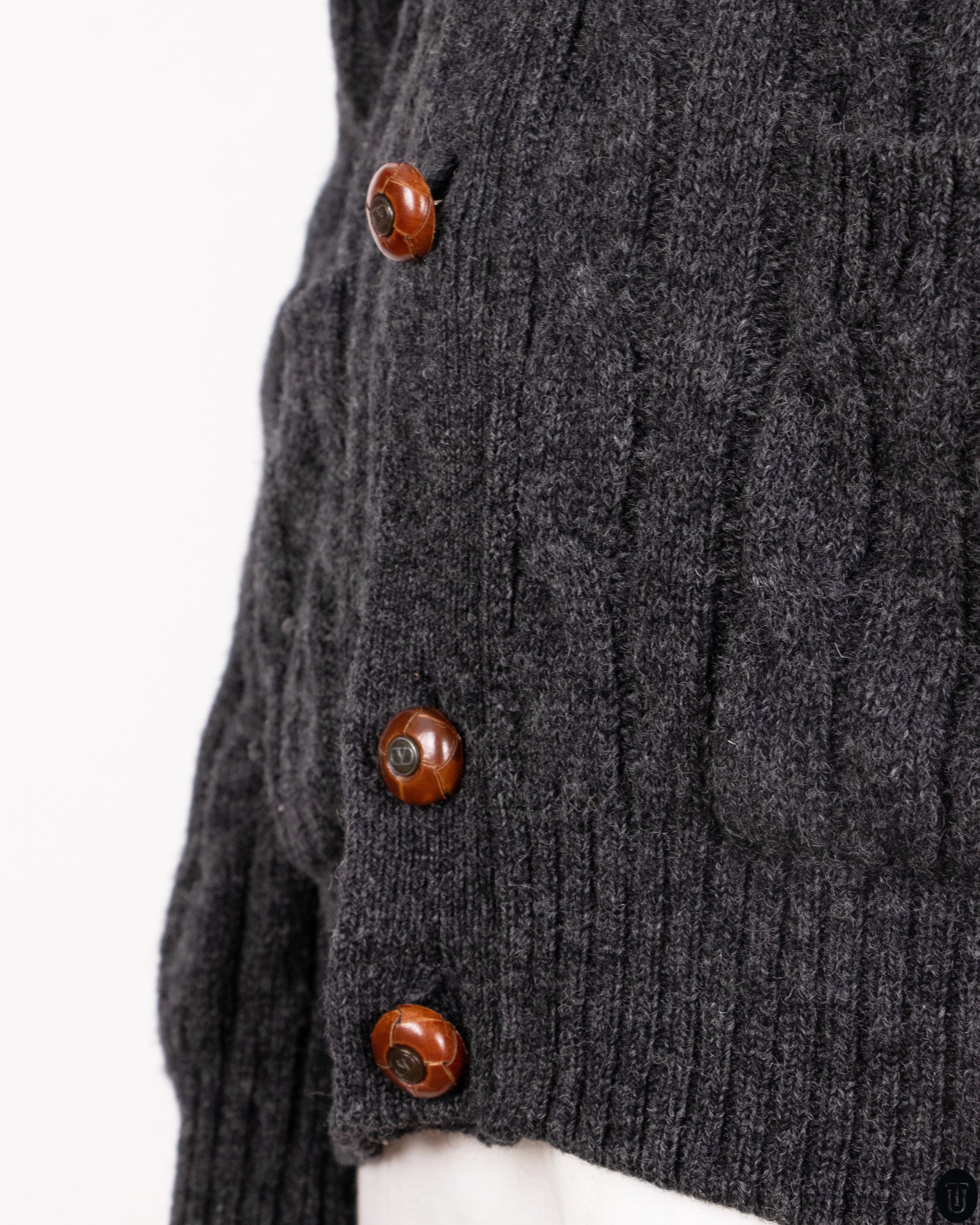 This 1990s Valentino wool cardigan embodies a refined take on rustic elegance, rendered in a dense, heathered charcoal wool with a prominent cable knit texture. The silhouette is relaxed, featuring a deep V-neckline, horn-style buttons, and patch pockets. The cardigan also features wool elbow patches and oversized front pockets.