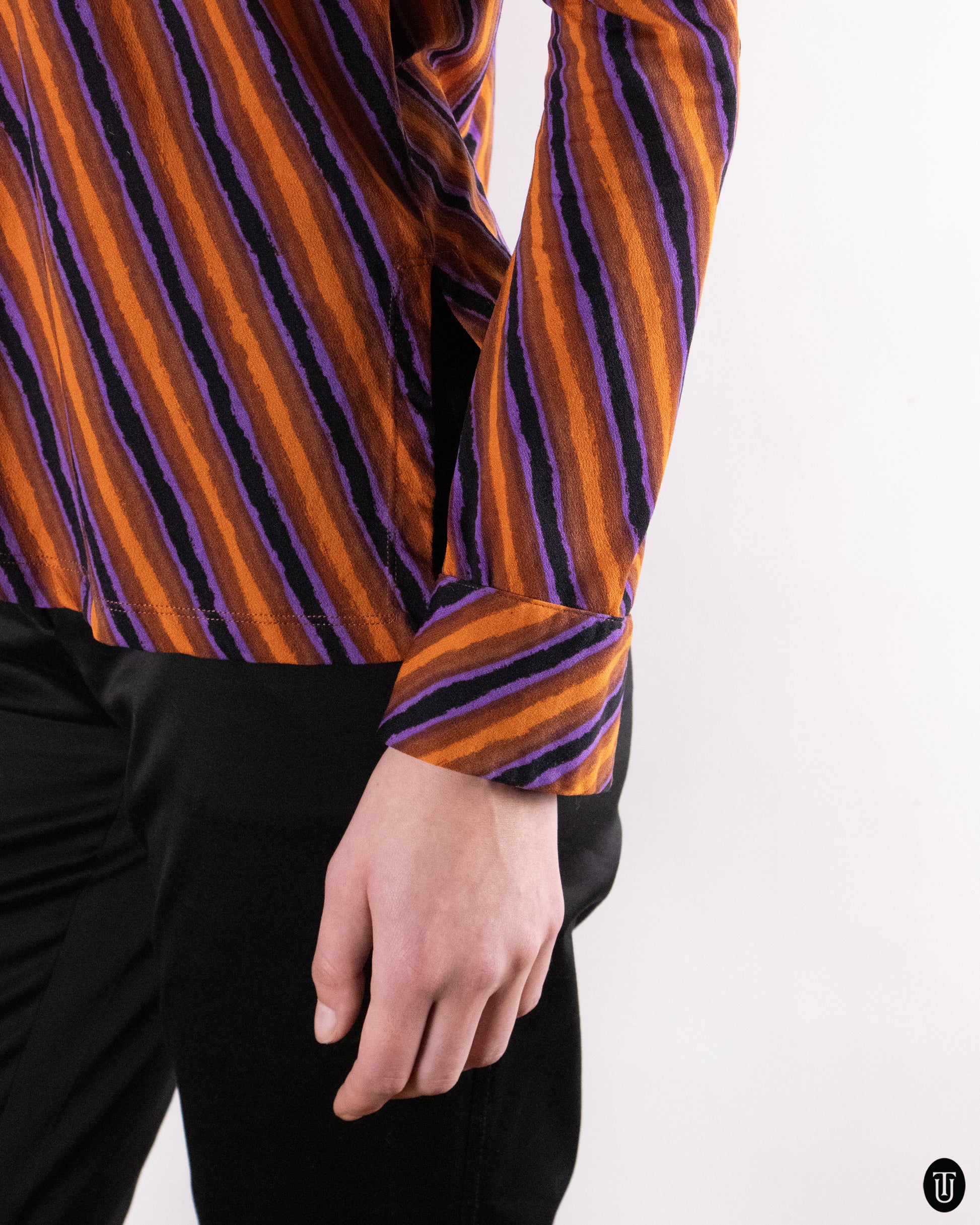This 1990s Romeo Gigli shirt is crafted from a lightweight, finely woven fabric that drapes softly against the body. The fluid handle allows the striped pattern to fall organically rather than sit rigidly, a signature of Gigli’s poetic approach to tailoring. It can be styled tucked into tailored trousers for a sharp, elongated silhouette, or worn slightly open and relaxed with denim or slouchy suiting to emphasize its fluid, sensual drape.