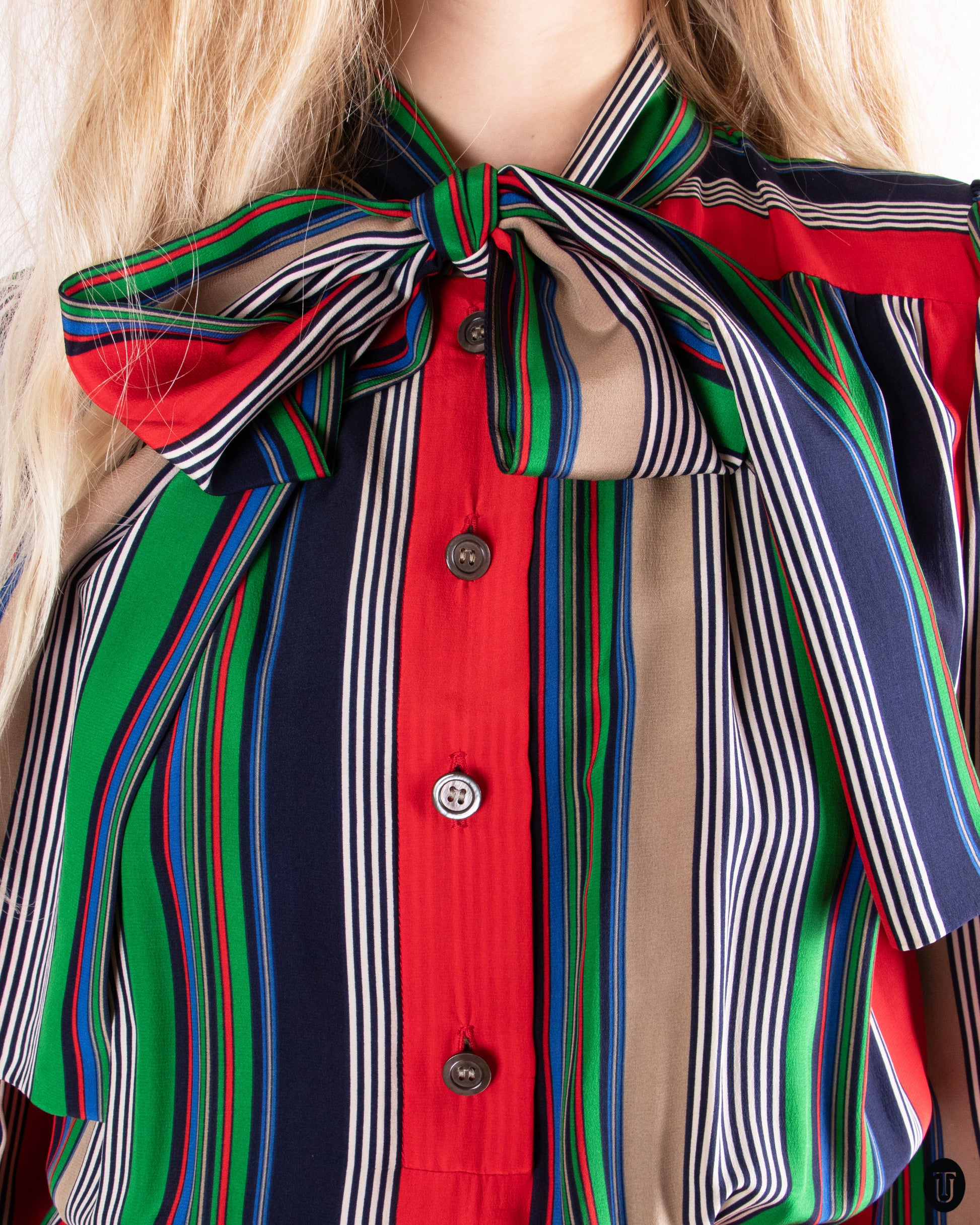 Any savvy collector of vintage fashion will know the value of 1970s Yves Saint Laurent designs. This 1970's silk dress with multi-colored striped print is certainly no exception to that rule, embodying both Yves Saint Laurent's iconic feminine mid 1970's silhouettes and the quality of the materials and prints that make these pieces so coveted. The dress features front button down closure, a pussy bow tie and a mid length pleated skirt.