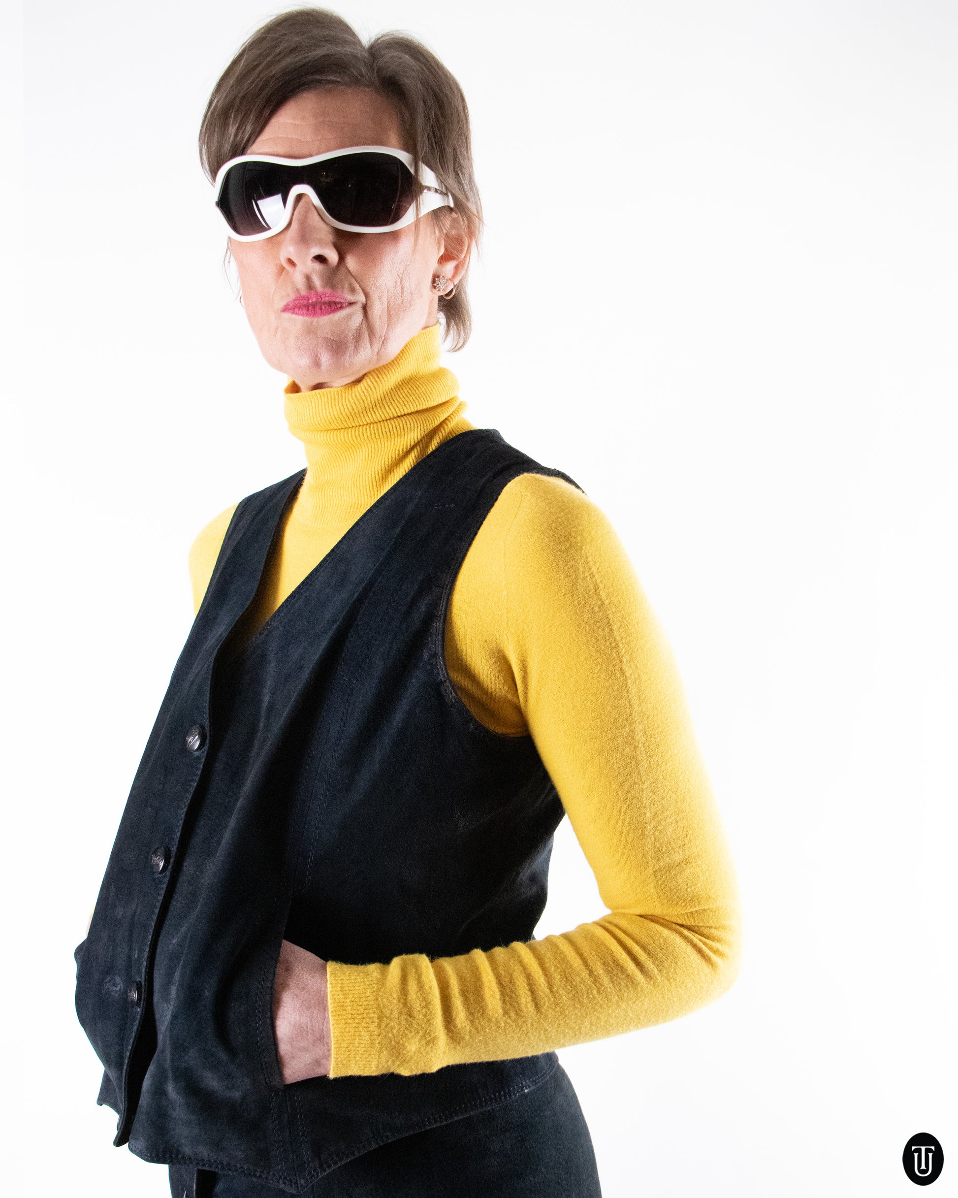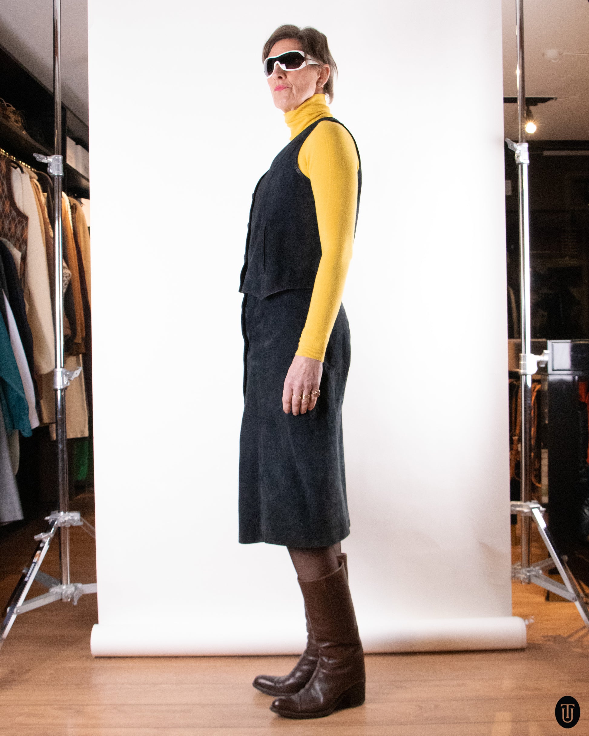 A rare Céline two-piece set from the 1970s. Crafted in black suede, the vest and skirt balance utility, luxury, and mastery of leather. The vest is cleanly cut with a V-neckline and button-front closure, sitting close to the body with a gently shaped waist that creates a sharp, tailored line. Paired with the matching skirt, the set reads elegant, relying on material and cut. Together, the pieces create a strong, elongated silhouette that feels distinctly Céline.