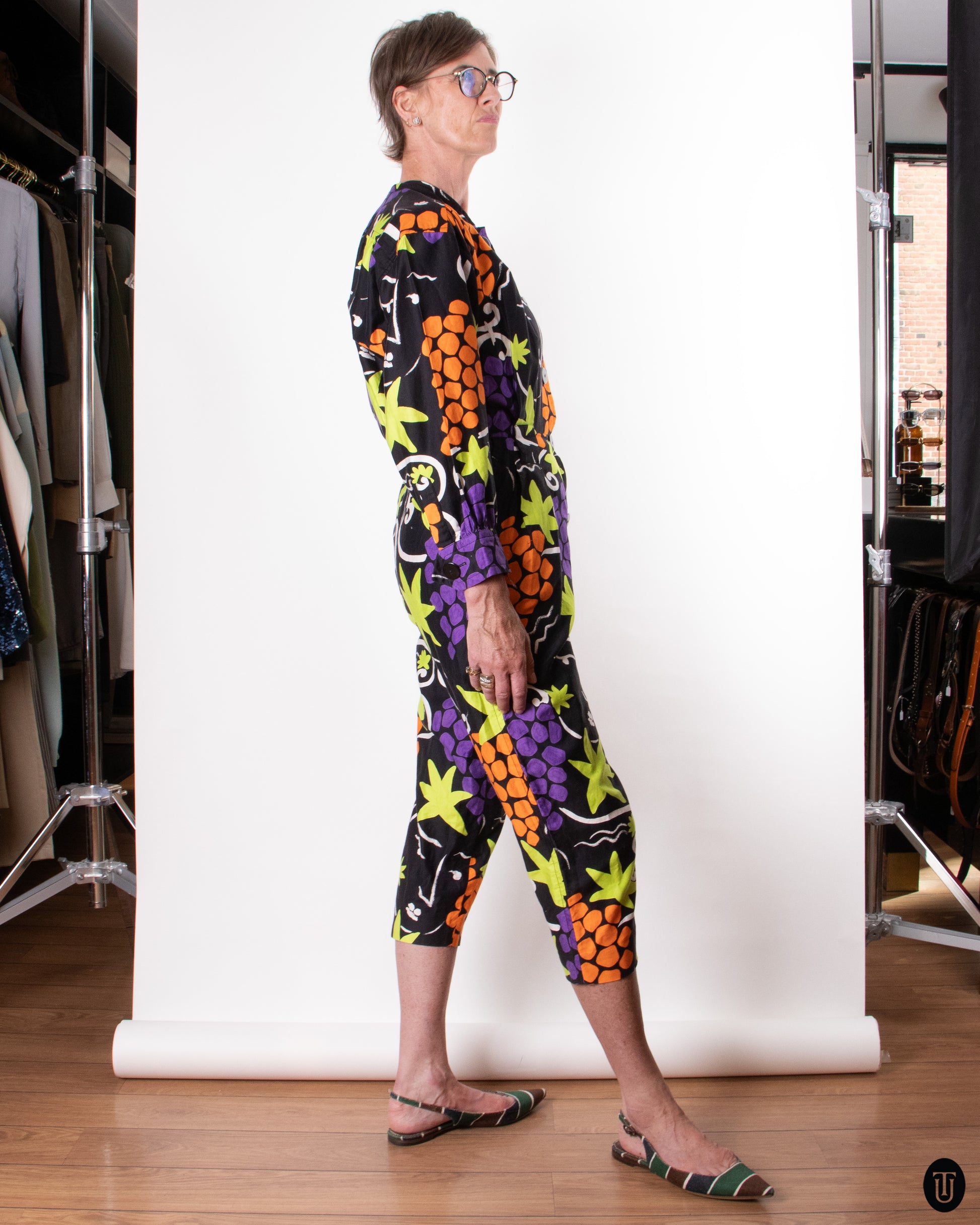 This 1980's Yves Saint Laurent jumpsuit is crafted from a light-weight cotton fabric, and features capri style length in the trousers. The jumpsuit features a high neck collar that is fastened by an oversized black button, that continue down to the navel. The abstract print adds drama and color blocking typical of the era.