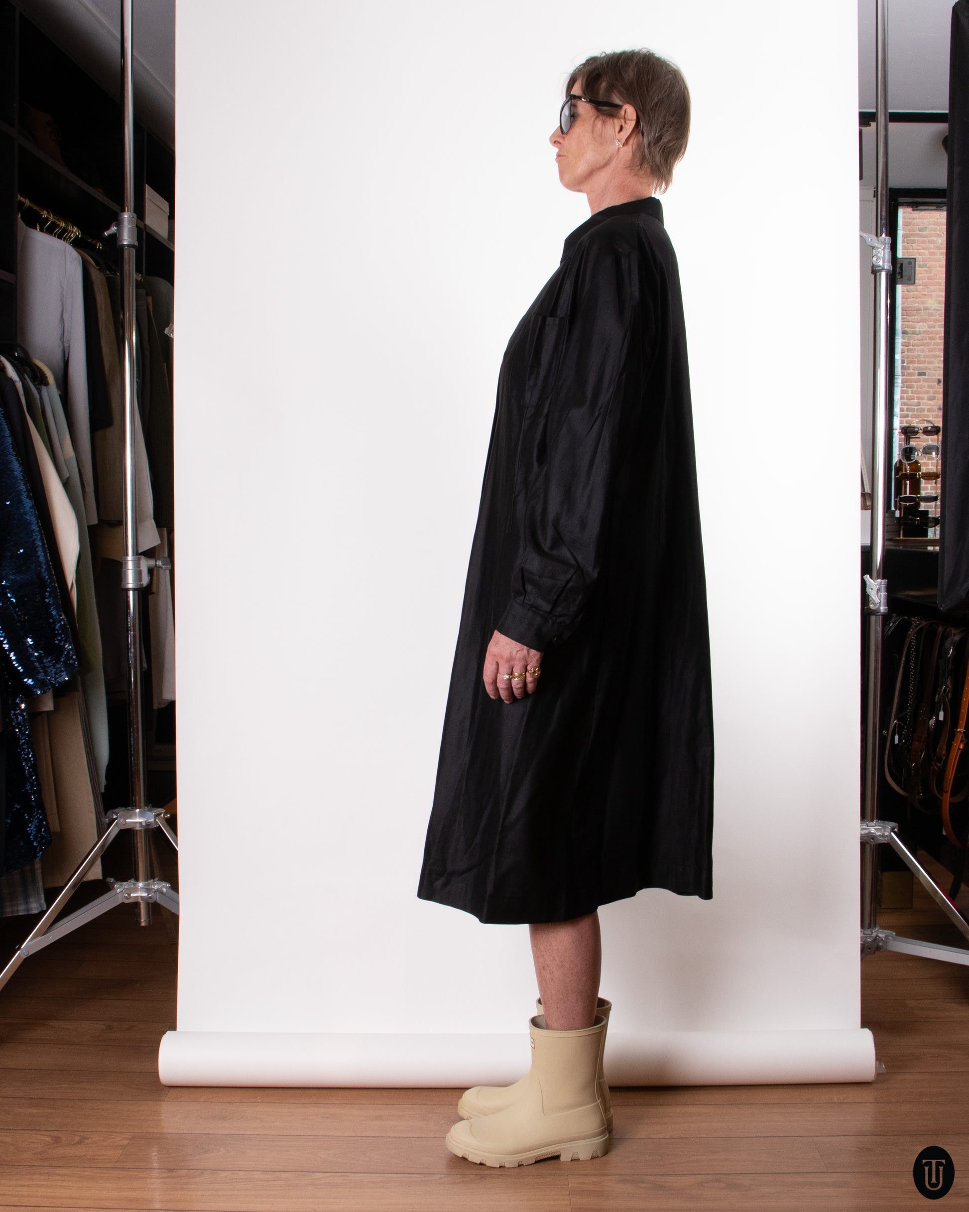 This 1990's long tailored jacket is by vintage Milanese brand Fraizzoli & co. It is constructed from a light weight sports like fabric, and is quintessential 90's minimalism. The jacket features a shirt collar neck line, cuffed sleeves, and symmetrical oversized pockets along the hip line. Finished with an a-line fit and falling just below the knee's, it is the perfect coat for fall layering.