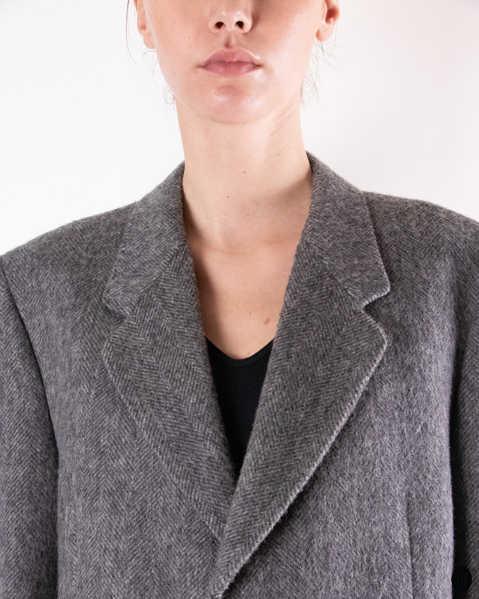 This 2000a Italian-made coat is crafted from a dense, high-quality wool. The fabric has a substantial weight, allowing the coat to fall straight and hold its shape. Tailored in construction, the coat is classic in cut and material, designed for longevity rather than seasonal trends. Made to be styled oversized or more traditionally, this is a versatile piece that embraces menswear codes while remaining entirely gender-fluid.