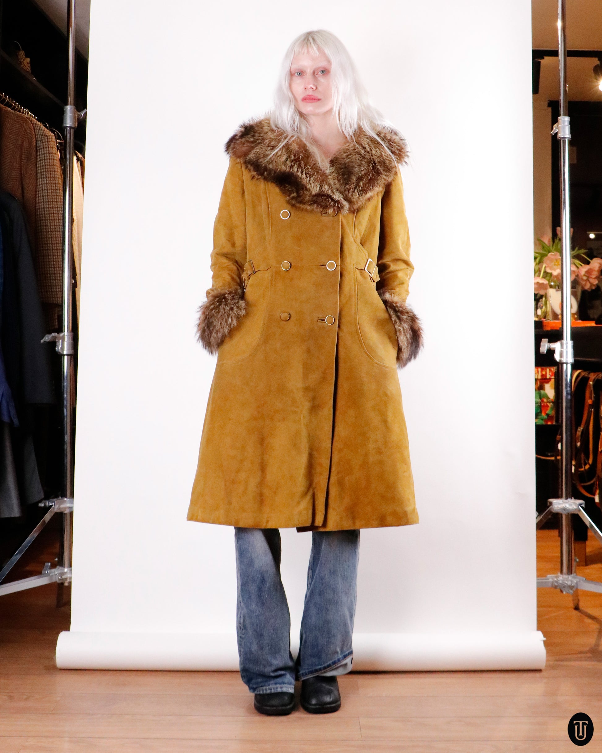 This 1970's A.C Bang coat is crafted from a heavy weight suede in a mustard brown hue, and adorned with fox fur along the lapelled collar and cuffs. The jacket features distinct gold double breasted buttoning, as well as gold buckles on the side to cinch the jacket at the waist line as needed. This coat is classically tailored, and made to wear through the harsh nordic winters.