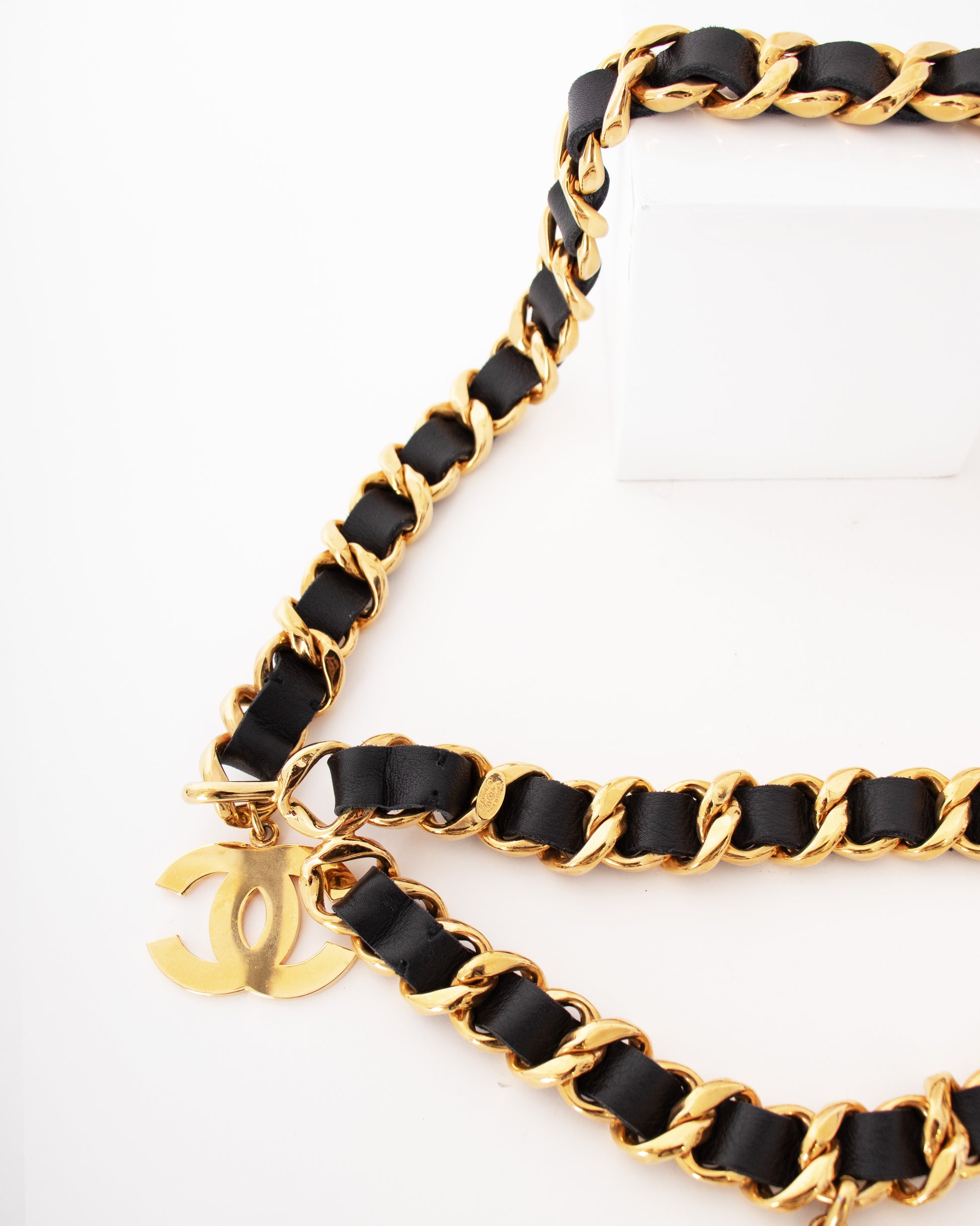 This 1980s Chanel belt is made from leather weaving through the gold chain links. It features classic gold chanel logo charms, and has multiple tiers, good for cinching any coat shirt or dress. The simple yet elegant design highlights the craftsmanship of the era, making it a versatile accessory for any wardrobe.