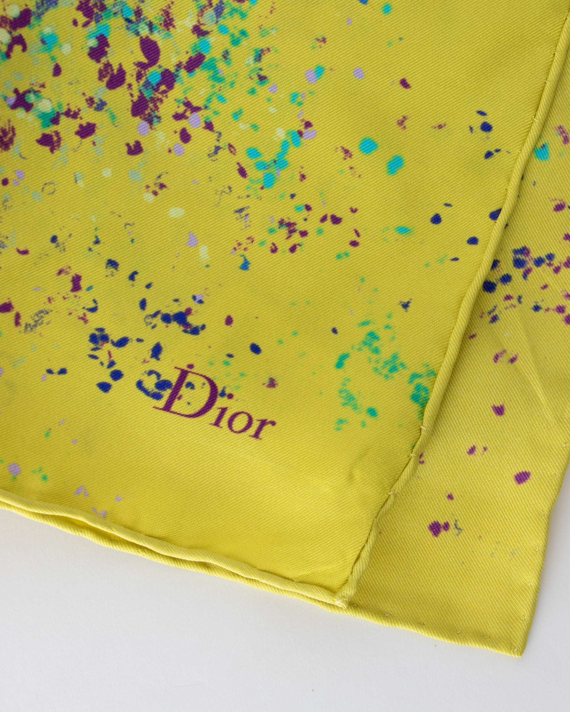 A silk scarf from Christian Dior in bright yellow silk with multiple multi-colored dots.