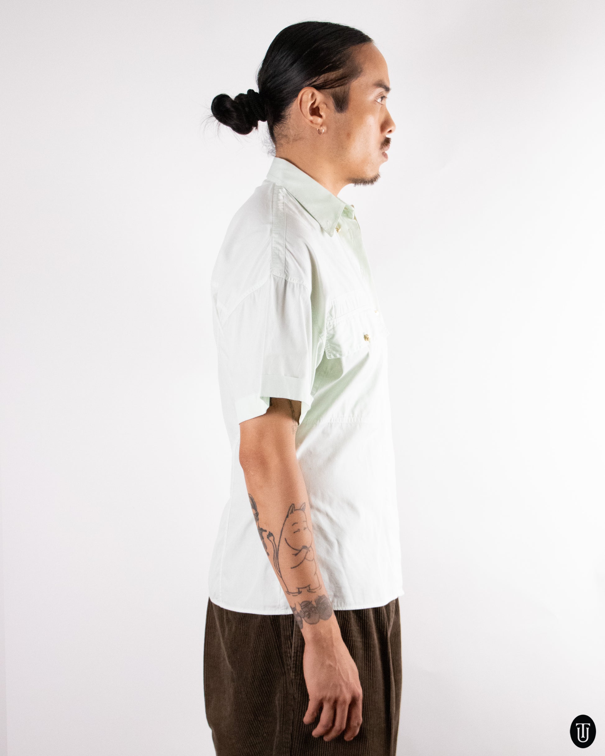 This 1990's Versus by Giovanni Versace button up t-shirt is crafted from a lightweight cotton in a mint hue. The otherwise straight fit cut has a slightly cinched waist line for a tailored fitted look and features gold accented buttons around the neckline and front pockets.