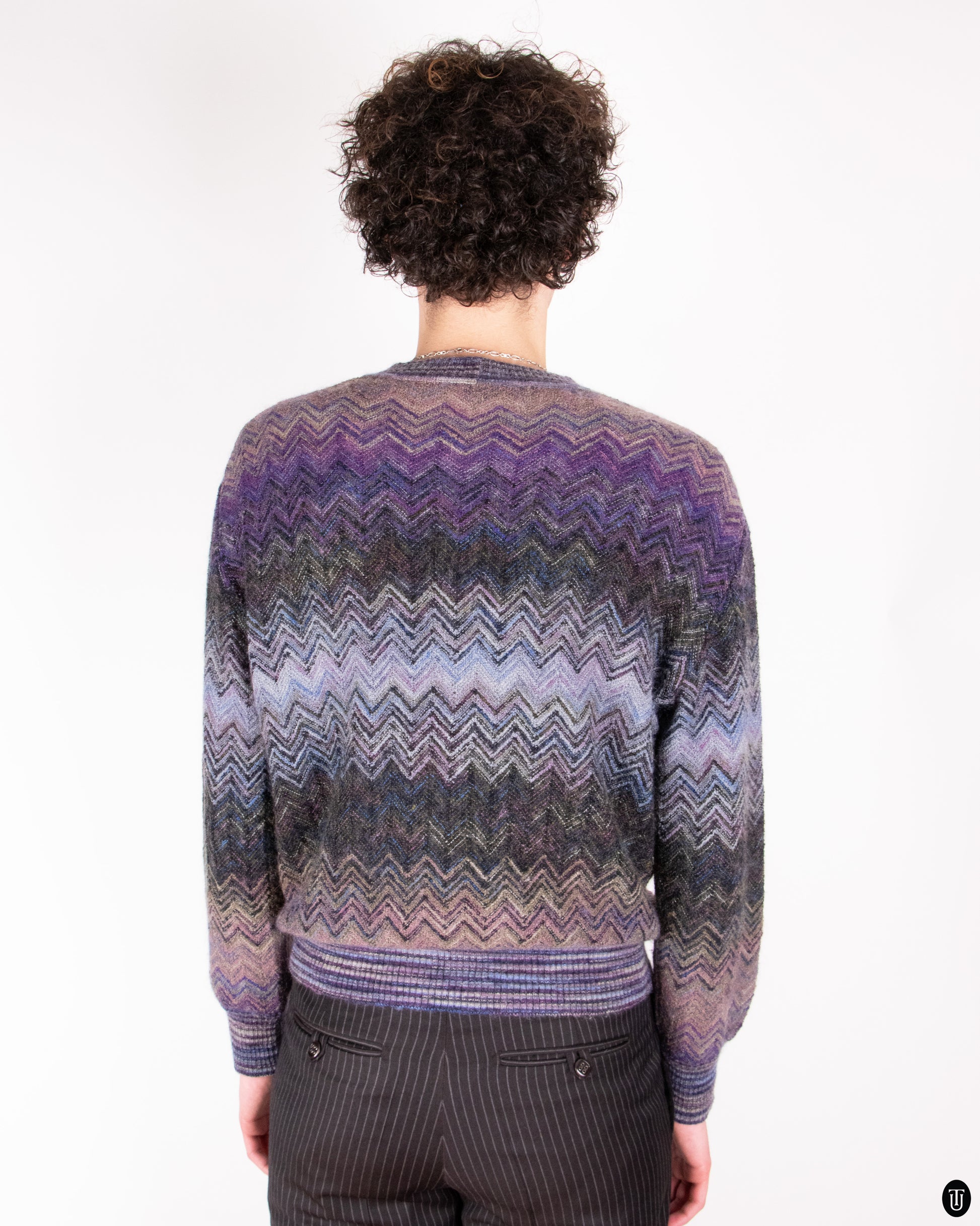This 1980s Missoni knitted jumper features the brand’s iconic zigzag knit pattern in a moody gradient of purples, blues, and earthy tones. The fine, lightweight knit and its texture highlight Missoni’s mastery of textile craftsmanship and color blending. With a relaxed and slightly cropped fit and ribbed hem and cuffs, it captures the effortless elegance and bohemian flair synonymous with the label’s legacy.