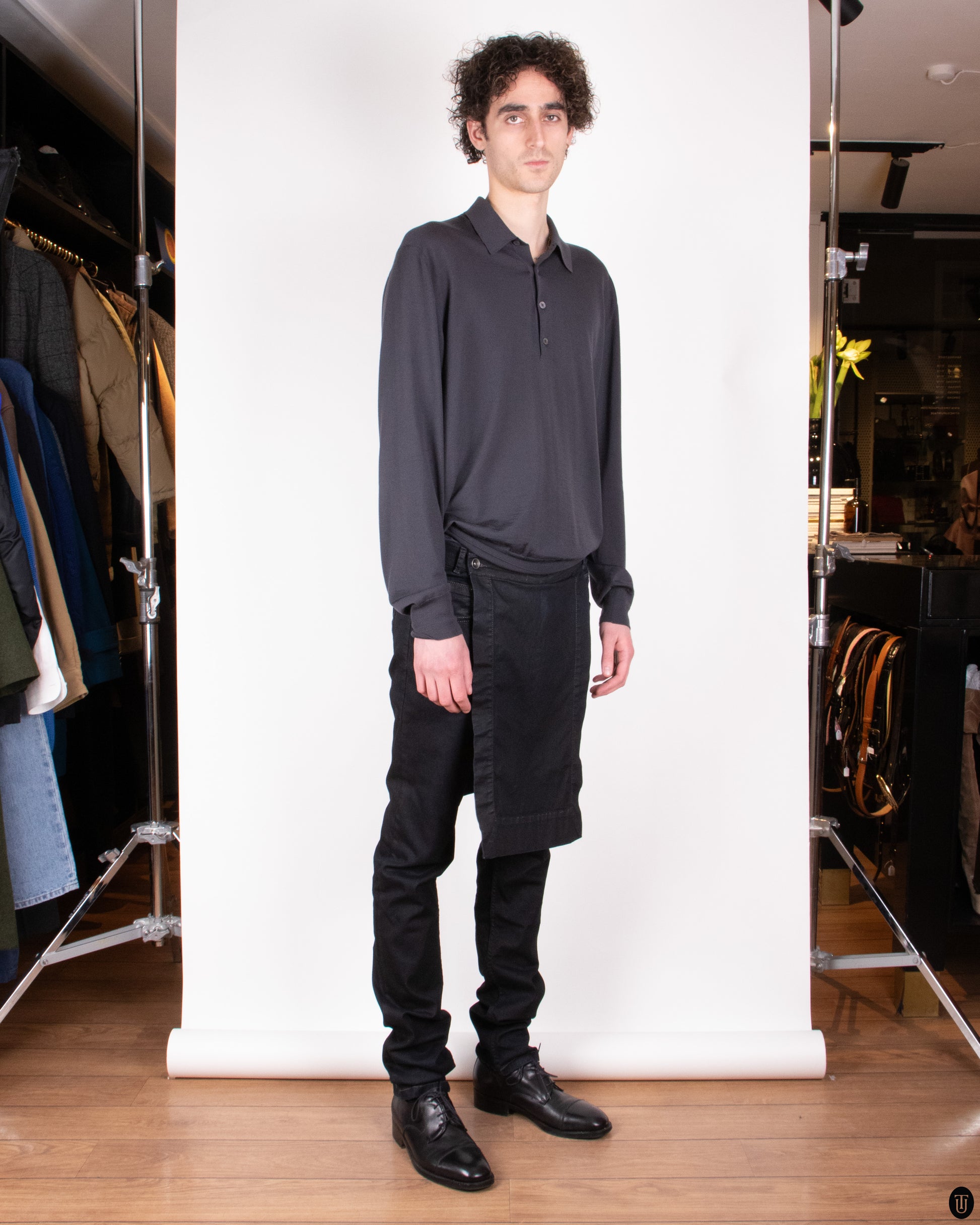 These 2000s Rick Owens pants showcase the brand’s signature architectural layering and dystopian minimalism. Cut in dense black cotton with a subtle stretch, they feature a sleek, tapered leg and are distinguished by an attached asymmetric apron panel that drapes over the front—adding depth and utilitarian edge. The clean, tonal stitching and concealed fastenings emphasize Owens’ commitment to refined, directional construction, making these trousers a bold yet versatile statement in avant-garde tailoring.